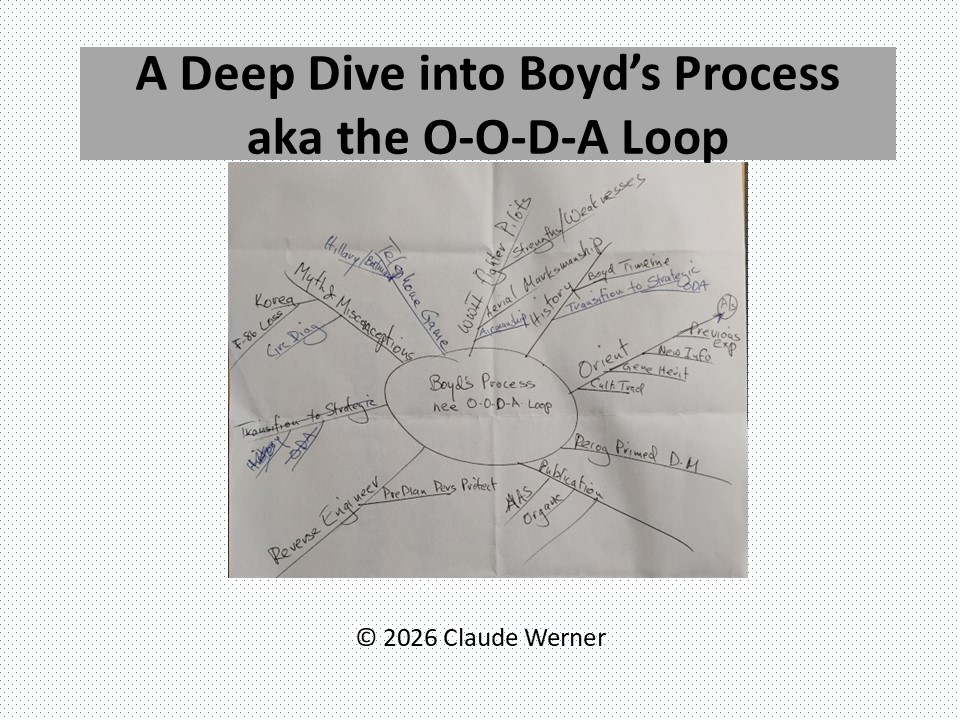 I gave my presentation A Deep Dive into Boyd’s Process aka the O-O-D-A Loop twice. It seemed to be fairly well received. My object was to dispel some myths and give a more detailed analysis of what Colonel John Boyd actually said.