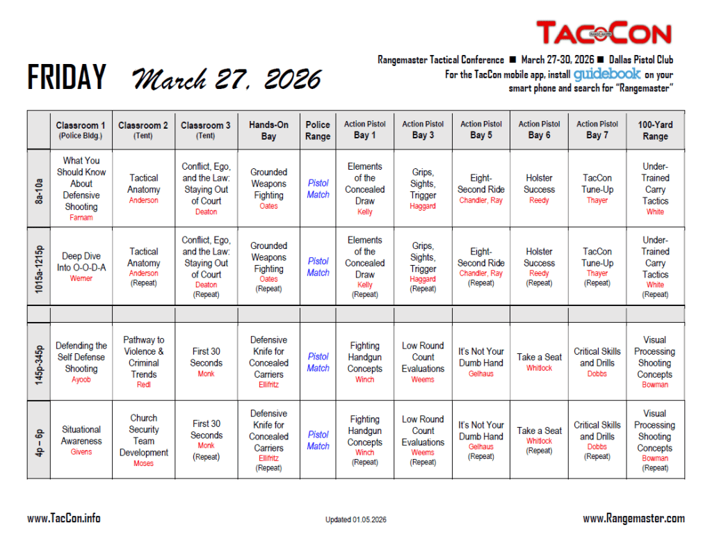 The 2026 Rangemaster Tactical Conference, aka TacCon https://taccon.info/, wrapped up last Sunday evening. It was three full days of training focused on personal development for self-defense and personal protection. A wide variety of subjects were presented in a buffet format. The classes ranged from live fire with pistols and shotguns to hands-on encounters without firearms to theoretical and philosophical seminars. Friday’s schedule gives a glimpse of the classes that are available.
