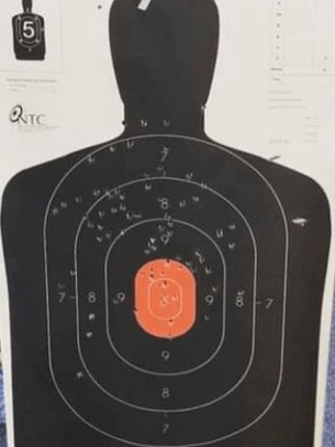 I used a target that I found on the range. The hits covered with masking tape are mine. The ones with pasters are from the previous and unknown shooter. The two hits just below the neck line were the ones probably the result of hammering.