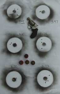 To quantify his questions a little further for myself, the LCP II .22 provided a good platform. The standard I chose was well established and very basic, no pun intended. The NRA Basics of Pistol Shooting standard is to put five hits out of five shots into a four inch circle. Coincidentally, four inches is also the size of the -0 head zone on the IDPA target. To apply this standard to the question of ‘maximum effective range,’ two circles were shot at 10, 15, 20, 25, and 30 feet. The question was at what distance did I fail to meet the standard.