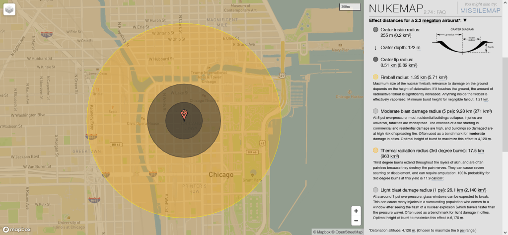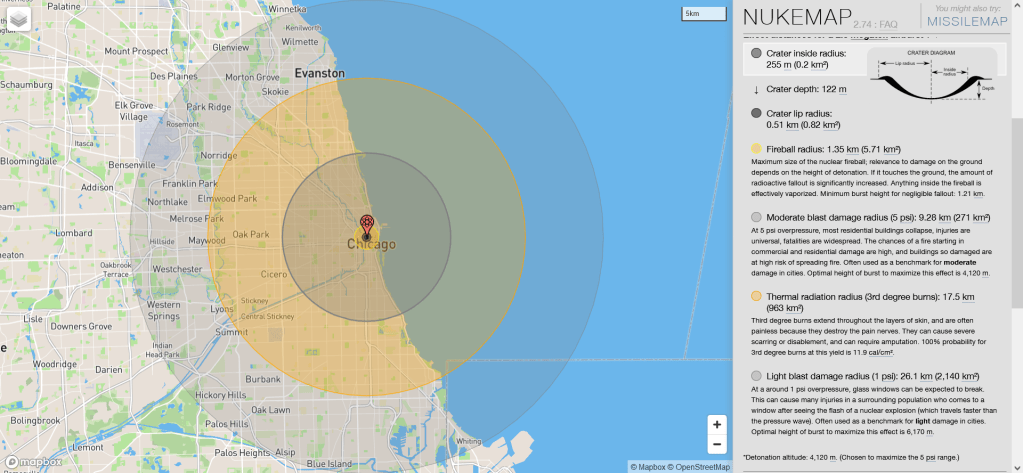 A bleaker picture emerged during my research. A 1990 Federal Emergency Management Agency document, the Nuclear Attack Planning Base, forecast more than just one weapon would have hit Chicargo. The city’s prominence as a population center and manufacturing base for the military-industrial complex at the time meant that most likely 12 weapons would have been targeted against the area. Probably most of Northern Illinois not only would have been destroyed but would have been completely wiped off the face of the planet. https://nuke.fas.org/guide/usa/napb-90/index.html
