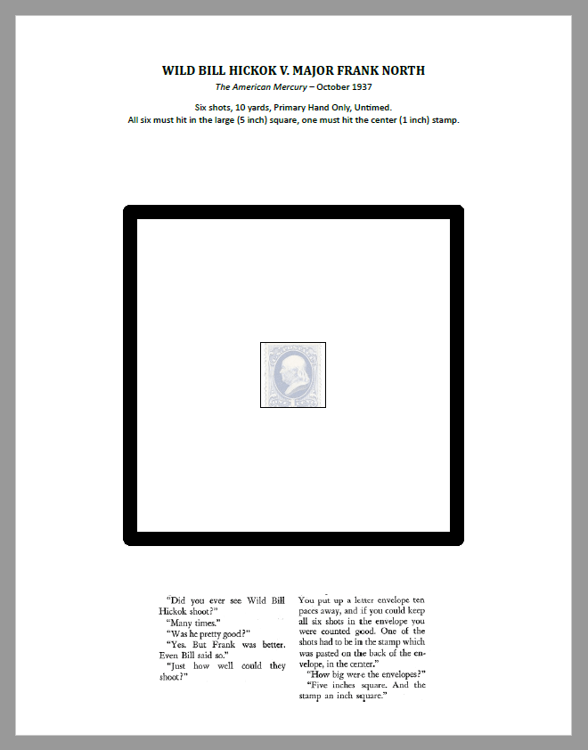 A PDF of the target is attached. This short challenge is easily shot at almost any indoor range. Try it out and see how your marksmanship compares to an Old West gunfighter like Wild Bill.