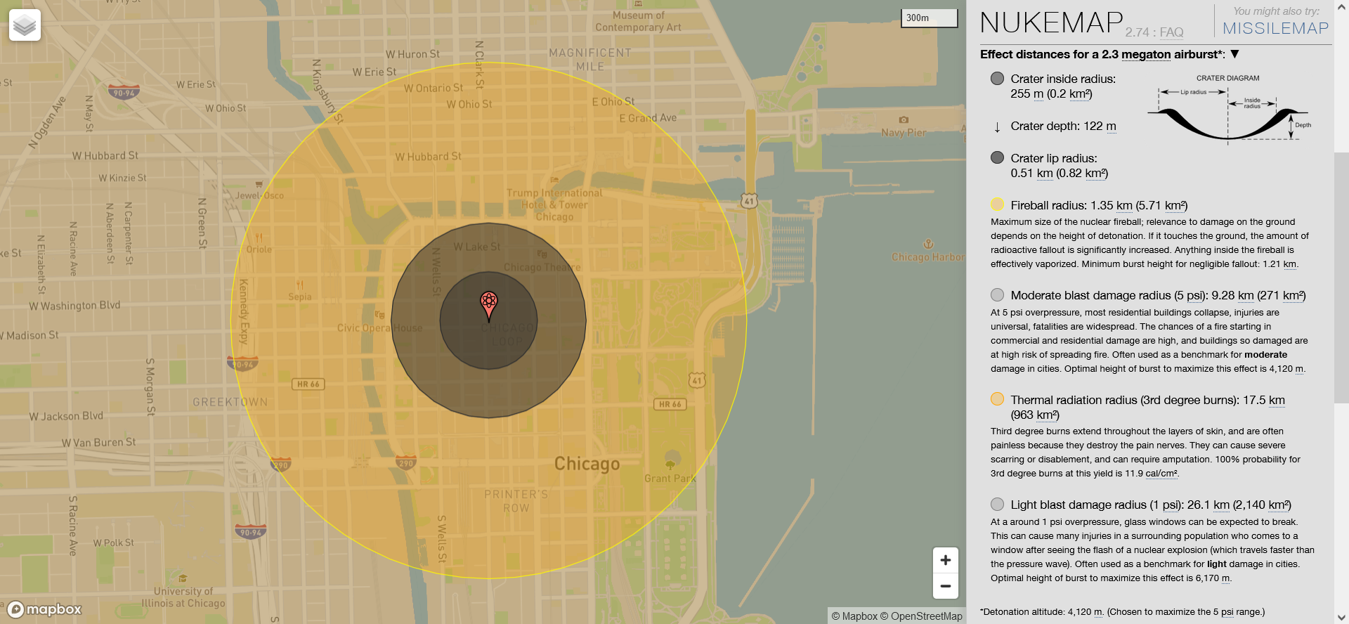 My research for this article uncovered a very informative website called Nuclear Secrecy by Professor Alex Wellerstein. An amazing part of the website is an interactive ability to input weapon and target parameters to generate a map of a weapon’s effects. https://nuclearsecrecy.com/nukemap/ All maps in this article are courtesy of Dr. Wellerstein’s website. Using this website provided even more accurate indicators of the destruction a weapon would have caused. The airburst altitude for the parameters chosen was 4,120 meters (13,596 feet).