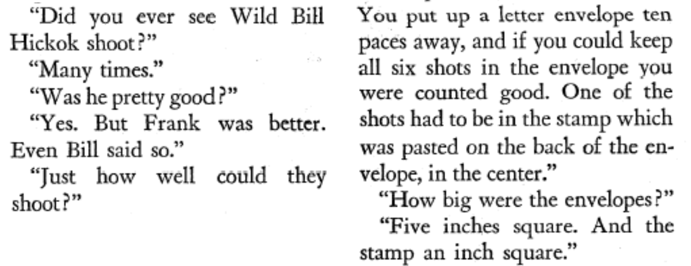 The American Mercury, a now defunct magazine, published an article in October 1937 titled “The Myth of the Two-Gun Man.” In it was a first hand account of what the Old West gunfighters actually considered ‘good’ shooting. The account came from Luther North, a contemporary of Wild Bill’s, and it is a far cry from hip shooting and unsighted fire.
