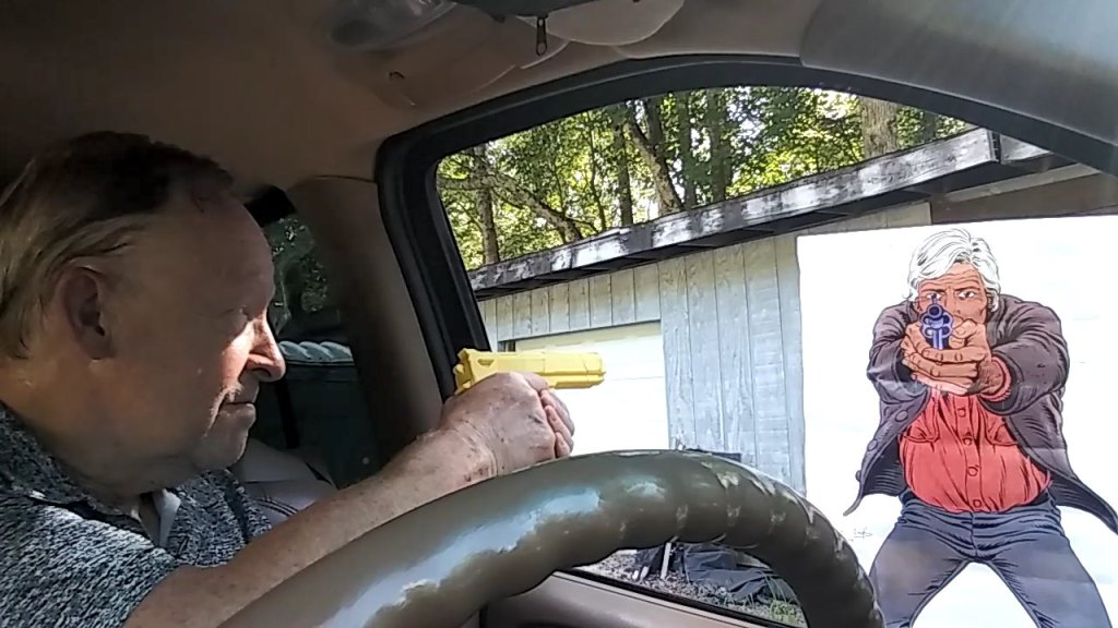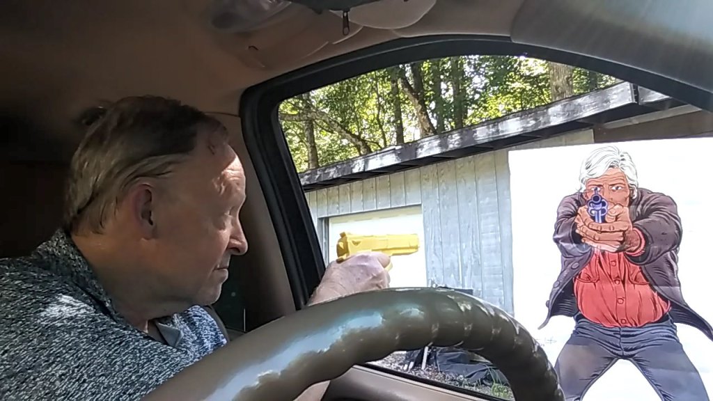 Shooting from the driver’s seat of a vehicle at a carjacker less than two yards away requires a different technique to be successful at making good hits. Using an inert pistol is a good way to try it out. They’re available for $20 or less at martial arts stores or online. Even if it doesn’t fit your holster, you can just put it on your lap.