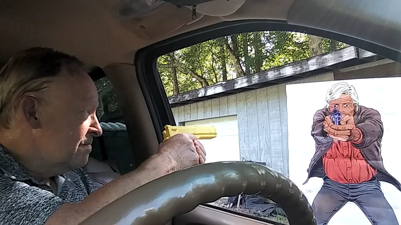 Shooting from the driver’s seat of a vehicle at a carjacker less than two yards away requires a different technique to be successful at making good hits. Using an inert pistol is a good way to try it out. They’re available for $20 or less at martial arts stores or online. Even if it doesn’t fit your holster, you can just put it on your lap.