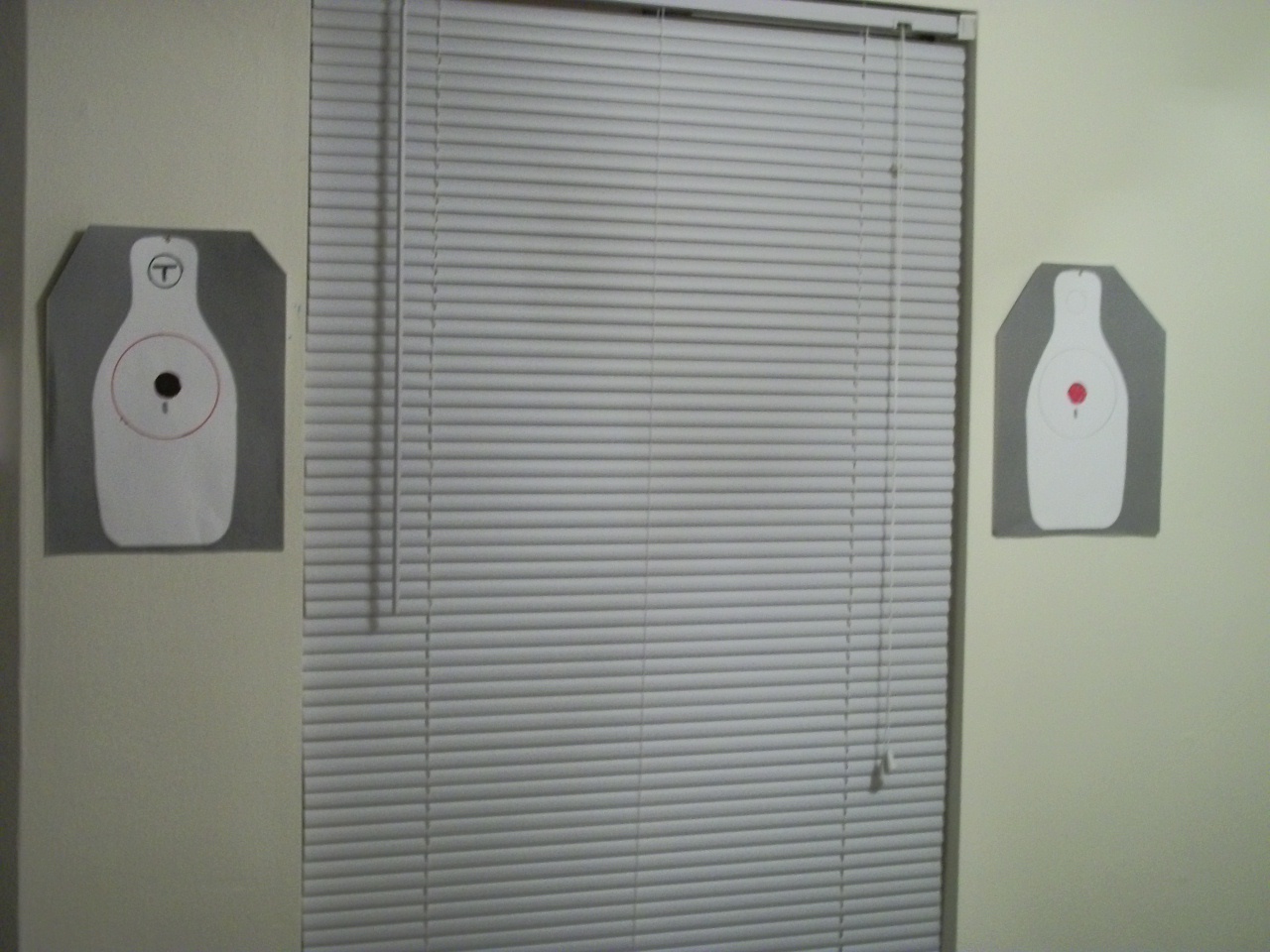 It occurred to me that I could use the same setup I use for the Air Marshal Tactical Pistol Course. I’ve modified that target setup slightly so I get more traverse on the multiple target strings. My setup also allows me to use both inside and outside techniques because of the arrangement of my apartment.