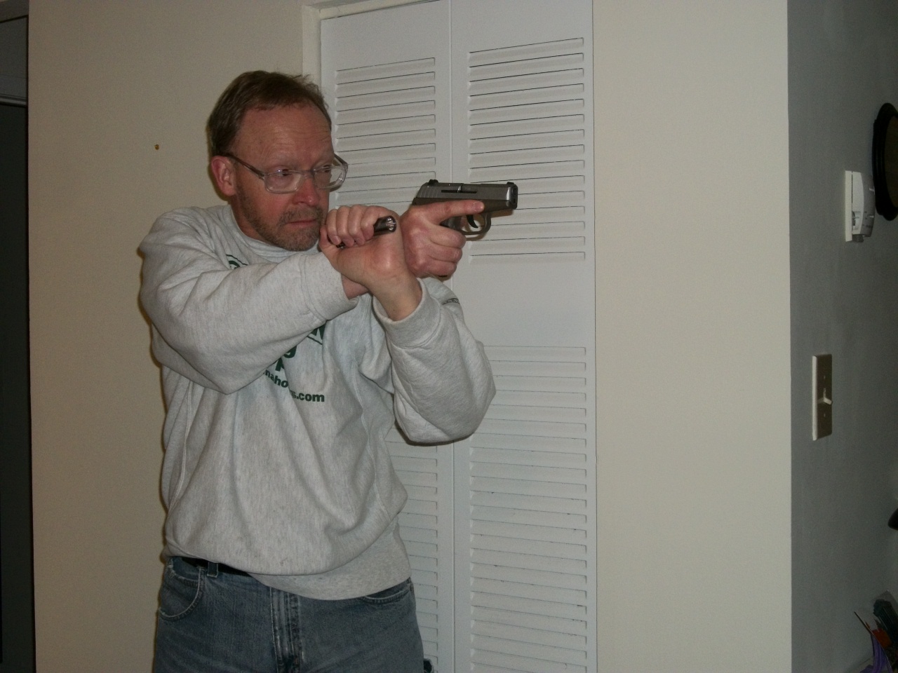 I started the Harries practice with the light pointing toward the target but the pistol down at low ready. Even when we’re identifying a target, we don’t want to muzzle them until the shoot decision is made. Then I practiced bringing the pistol up on target while keeping the light pointed at the target. At first, I did this in the hallway, just to get my mechanical movement correct.