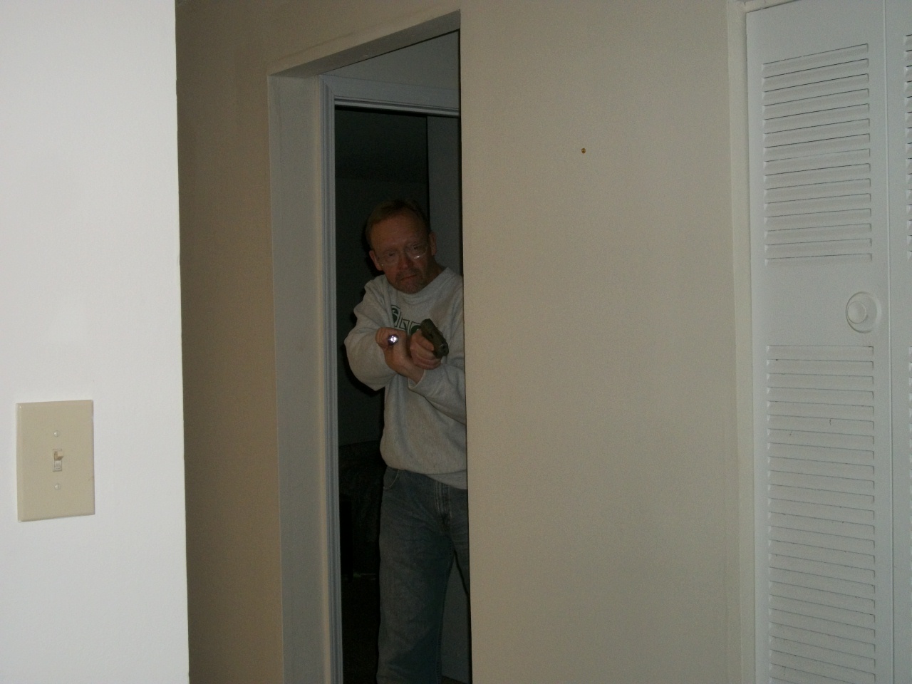 For the cheek practice, once again, I started with the light pointing toward the target but the pistol down at low ready. Since I use the cheek technique as a general search technique, this means I’m going to be shooting one handed, if the shoot decision is made. I like the cheek technique as a general search technique because it allows me to use the light as an impact tool, if necessary. Because there is a possibility during a general search, I would be in a hallway when shooting started, I incorporated turning off the light after the shot and taking a sidestep. But, there’s not much maneuver room in a hallway, so don’t think this is some magic potion that prevents getting shot.