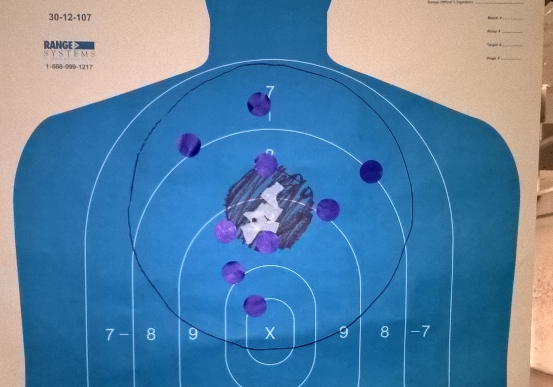 The purpose of this exercise is to demonstrate that the sights do not have to be perfectly aligned to get an acceptable hit on a silhouette size target. Many people waste time trying to get a perfect sight picture when it isn’t necessary. This principle of acceptable misalignment is the basis for what is called the “flash sight picture.” What we are trying to do is to get the front sight close to our aiming point and then refine the sight picture only to the extent we need to in order to get an acceptable hit. As your skill improves, your groups will get smaller and smaller but the principle remains the same.
