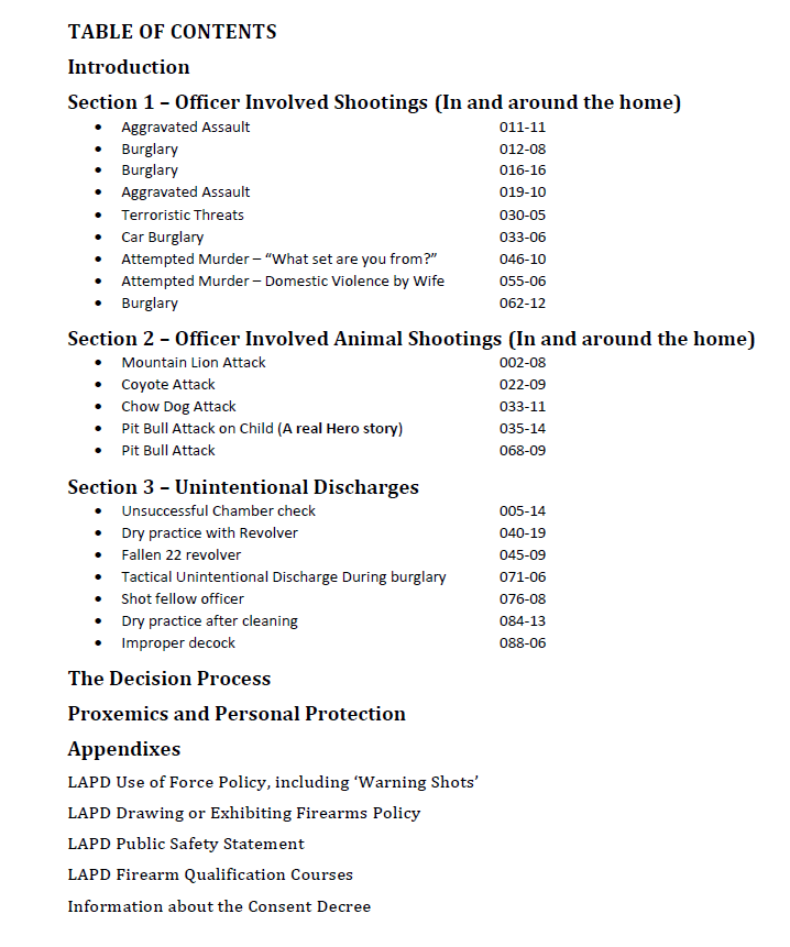 This book is a collection and analysis of those reports. They are stories of Officer Involved Shootings, Officer Involved Animal Shootings, and Unintentional Discharges drawn directly from those reports. The Public Reports also include the Board’s Findings (rulings) as to whether the incident was In Policy or Out of Policy. Contrary to popular belief, not all LAPD Shootouts are ruled to be In Policy.