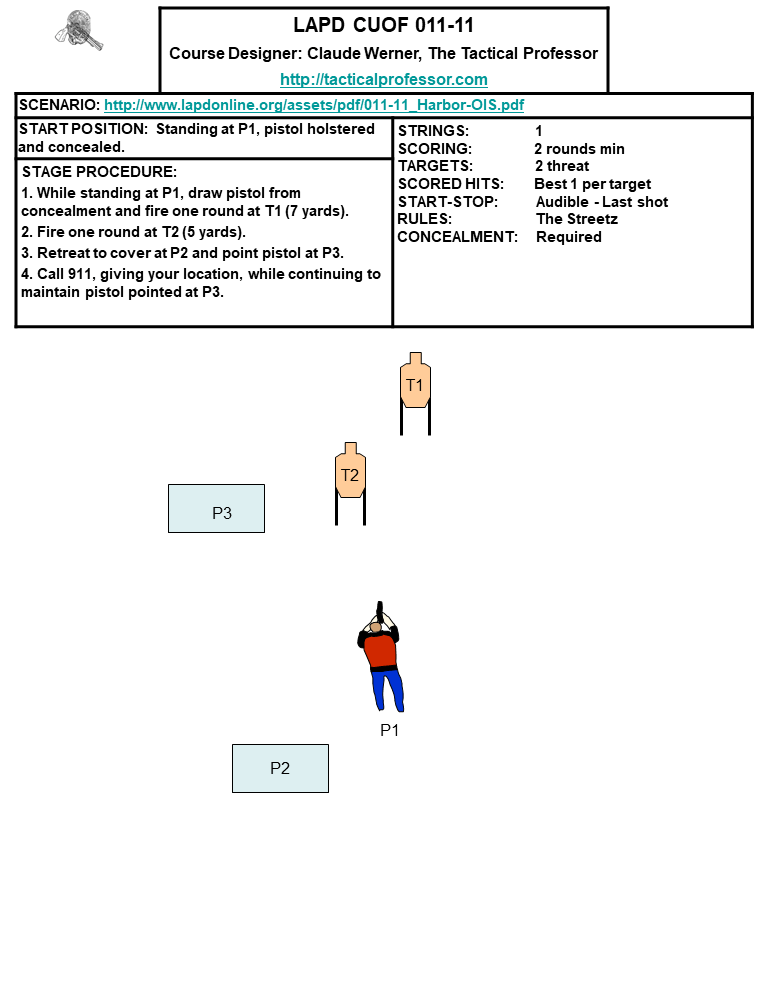 Reading about Real Life incidents, such the LAPD Categorical Use of Force reports, is interesting but what good is it if we don’t put some of the lessons learned into practice? One way to make that knowledge actionable is to translate the incident report into a Course of Fire that we could actually shoot. The various action shooting sports, such as IDPA, USPSA, etc., call this Stage Design.