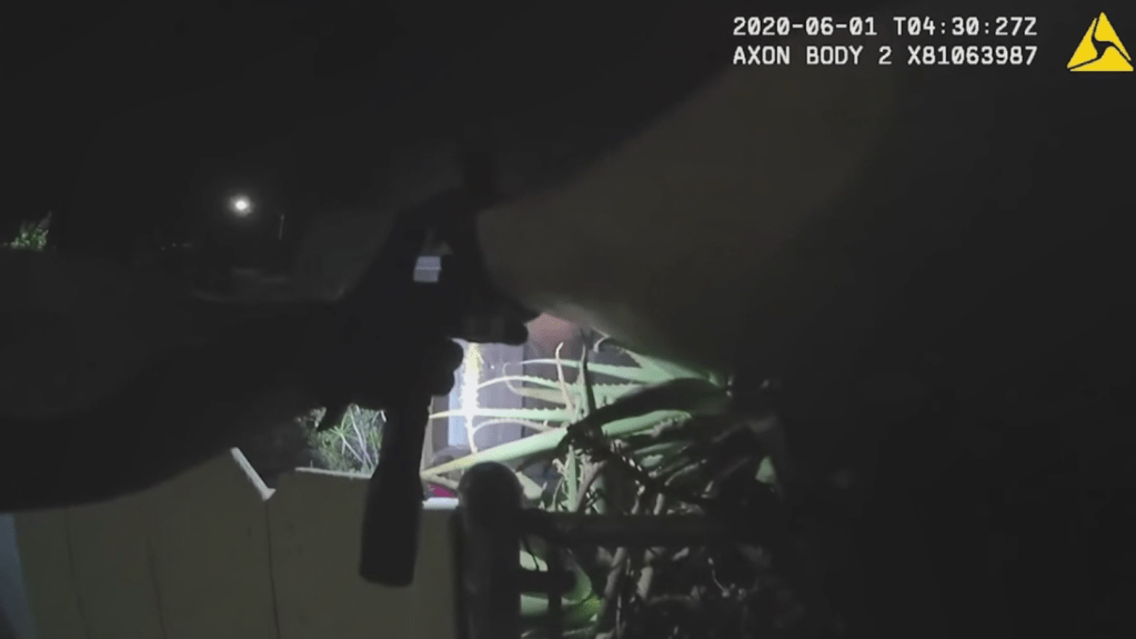 Since the animal was a pit bull, Officer Aguila told Officer B to bring her an off-duty snub nose revolver from the car. Officer B brought the revolver and tossed it over the fence to Officer Aguila. She then made her way to the back. To get to the back door, she had to plow through the rose bushes that blocked off the yard.
