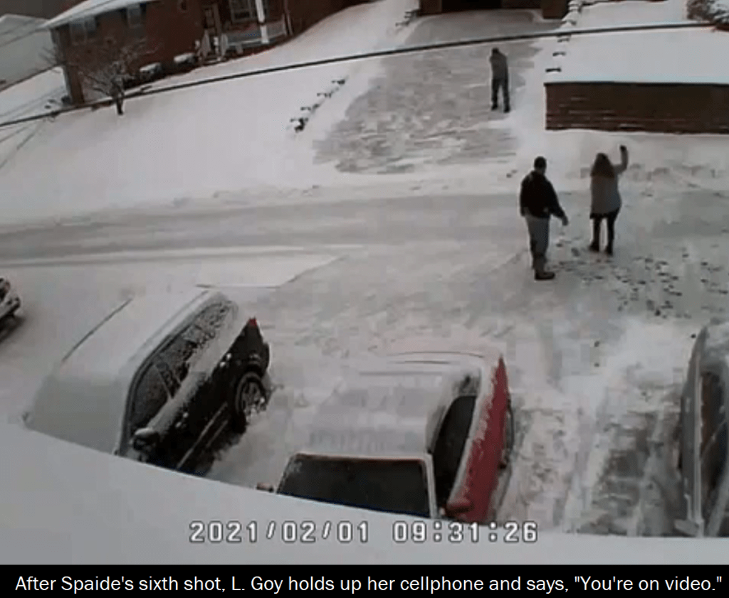 Lisa Goy got her phone out of her pocket after Spaide re-emerged from his home. Once she had the phone out, she said “Go ahead” three times as she closed the distance toward Spaide. She held the phone up in the air. Between Spaide’s sixth and seventh shots, she said, “You’re on video.”