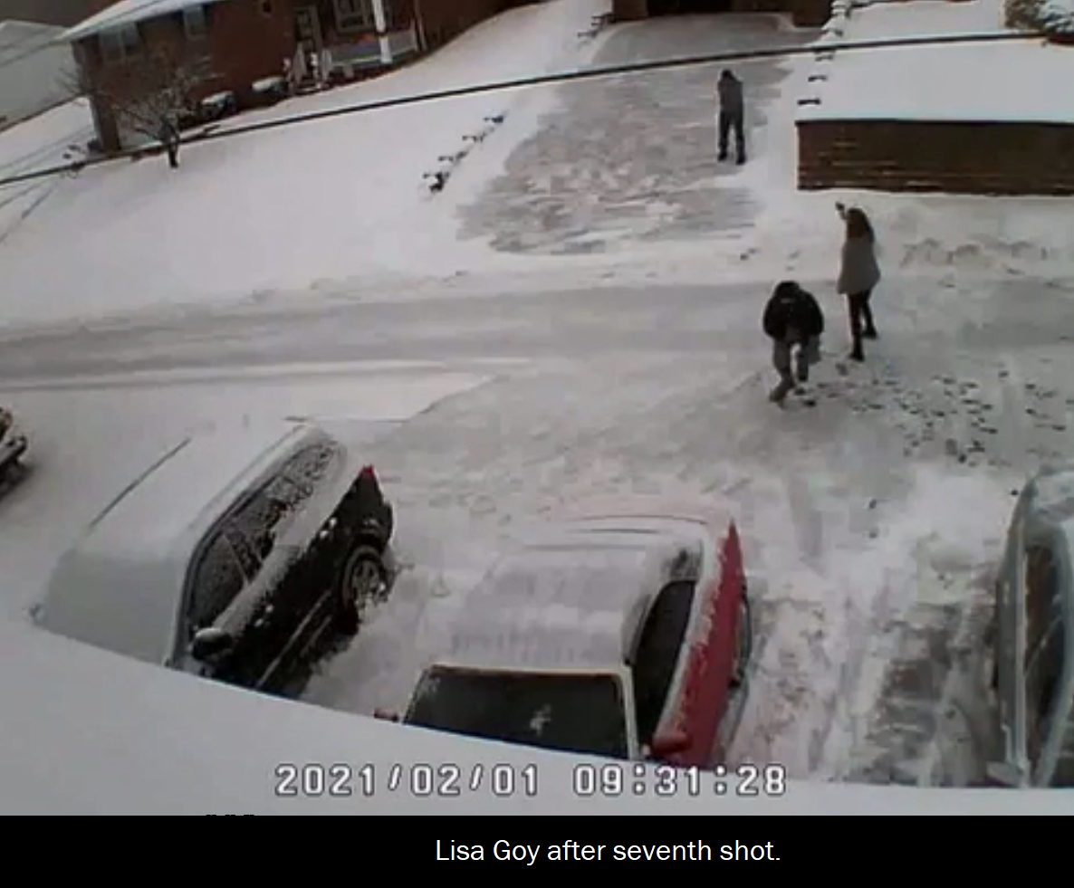 Spaide then fired his seventh shot, which hit James Goy. Lisa Goy then holds the phone even higher as she takes another step toward Spaide. Note her foot placement as compared to just before her husband was shot.