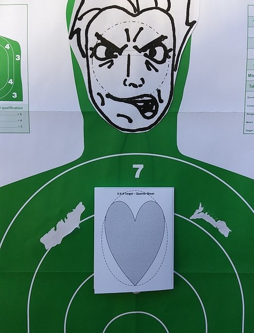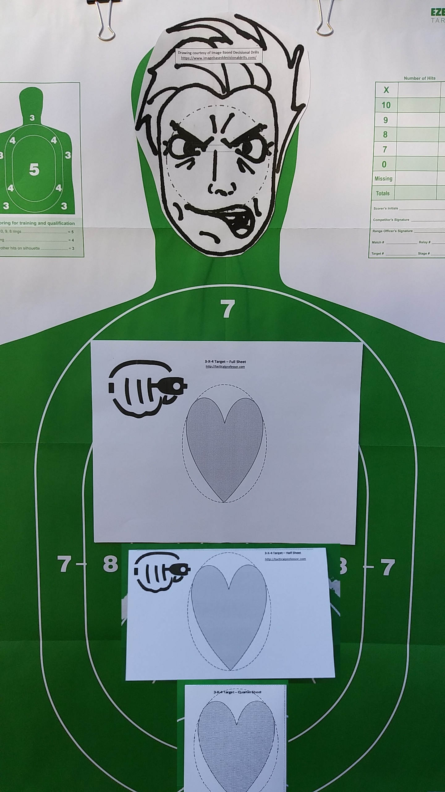 Tape it to the head of a silhouette target. It is anatomically sized correctly by using the ocular distance indicated by the line with arrows on the male mugshot of Dennis Rader, the notorious BTK Killer. https://www.biography.com/crime-figure/dennis-rader The dashed circle is sized to four inches in diameter. The pretty lady is a mug shot too, unfortunately, but she serves the purpose of occupying the place of a NO SHOOT.